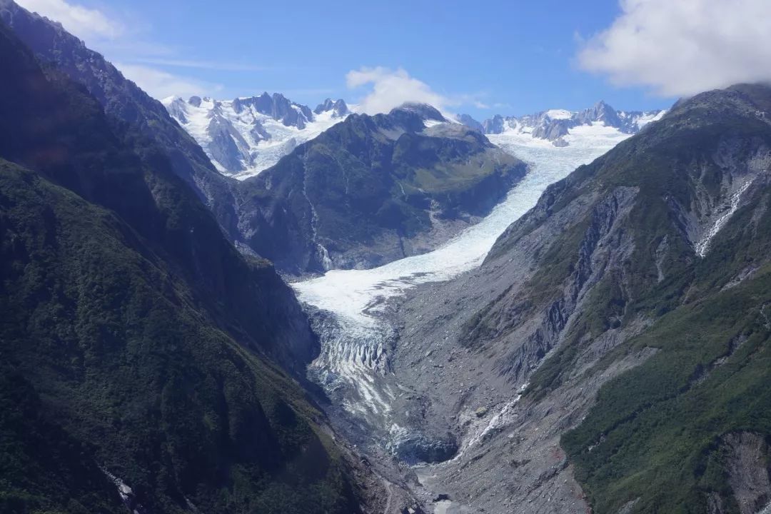 是因为这里的冰川峡谷狭窄而陡峻,使得冰川能够打两千多米高的冰原一泻而下,俯冲至海拔仅两百多米高的峡谷底部。福克斯冰川和弗朗兹约瑟夫冰川是世所罕见的低海拔冰川。