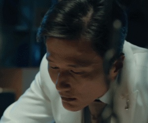 《幻影特工》里,尹子维顶着一头银发,准备开枪杀人。他并不着急要了对方的性命,而是先扬起一抹坏笑,像个绅士一样赞美对方漂亮,紧接着,一枪染红了目标的白色婚纱。