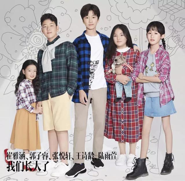 照片里,阿拉蕾(崔雅涵)、天天(张悦轩)、angela(王诗龄)、贝儿(陆雨萱)、石头(郭子睿)站成一排,个头差得还挺多,年纪最小的阿拉蕾才到天天的腰部,而比她大3岁的王诗龄个头快要赶上天天了。