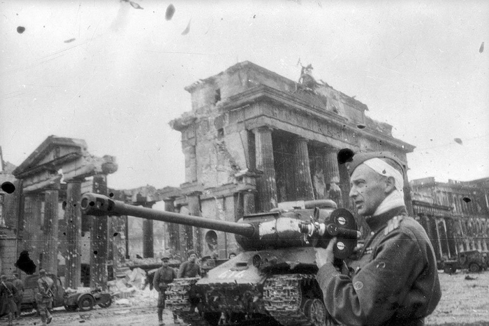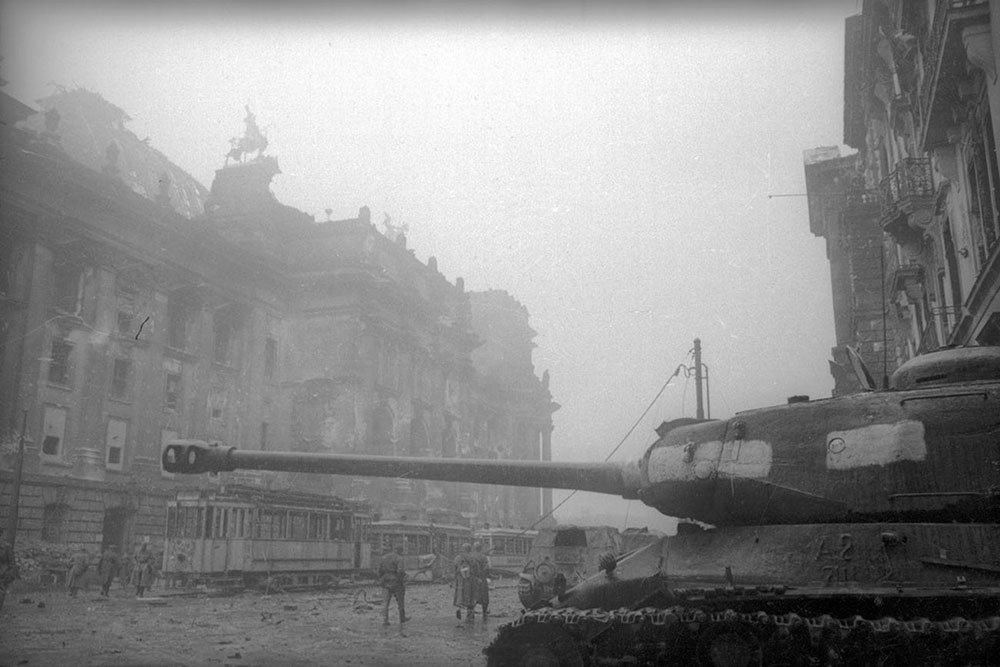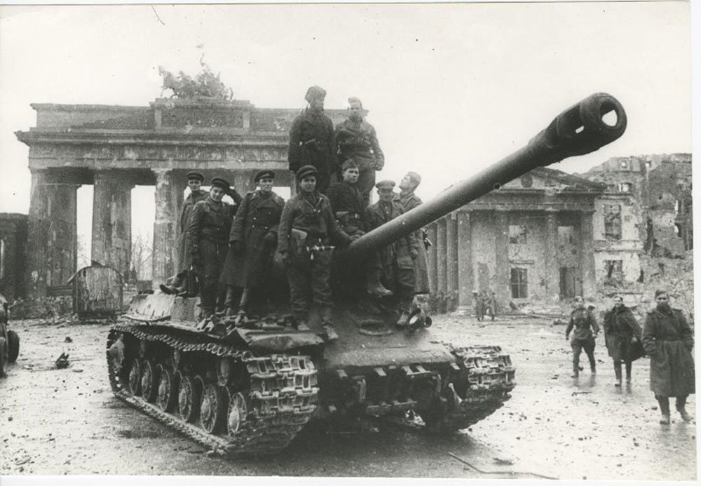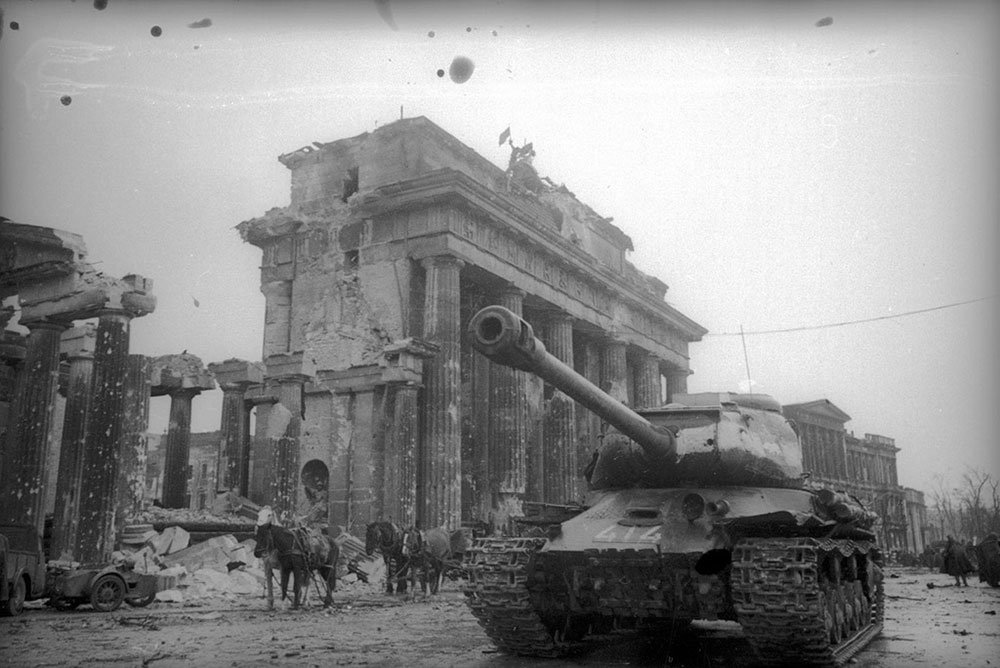 1945年5月,苏联红军打进德国首都柏林,这是白俄罗斯第1方面军第8近卫军第7近卫重型坦克旅的IS-2重型坦克,它正停在勃兰登堡门前,这里是德国最著名的地标性建筑物。