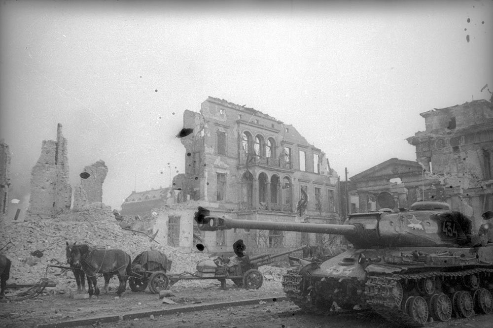 这张照片中可以看到苏军骡马拖曳的ZIS-3型76.2mm加农炮,这种堪称“万金油”式的火炮,成为苏军获得胜利的重要武器。照片右侧的434号IS-2M重型坦克同样非常有名,炮塔上的红星有白色的北极熊涂鸦,非常有个性。