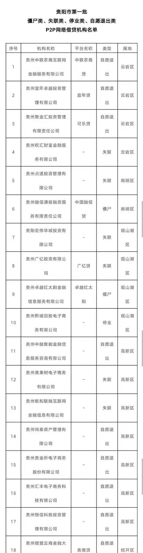 附:贵阳市第一批僵尸类、失联类、停业类、自愿退出类P2P网络借贷机构名单