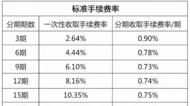 1、分3期时,一次性支付的费率为2.65%,分期支付的费率为0.9%