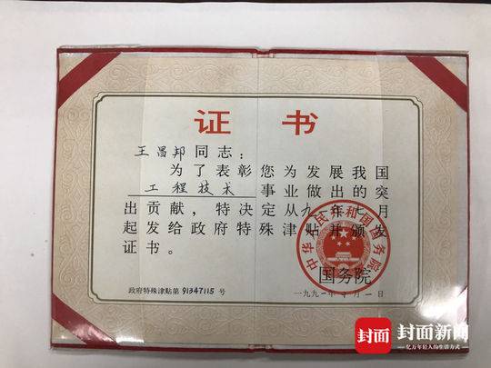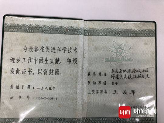 “为表彰在促进科学技术进步工作中做出贡献,特颁发此证书,以资鼓励。”这是一份由国家科学技术进步奖评审委员会于1985年颁发的光荣证书,上面记录着荣誉获得者王昌邦的贡献—在复杂地质、险峻山区修建成昆铁路新技术,获奖等级则是“特等”。