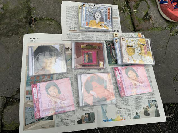 用报纸摊在地上卖的邓丽君正版专辑。
