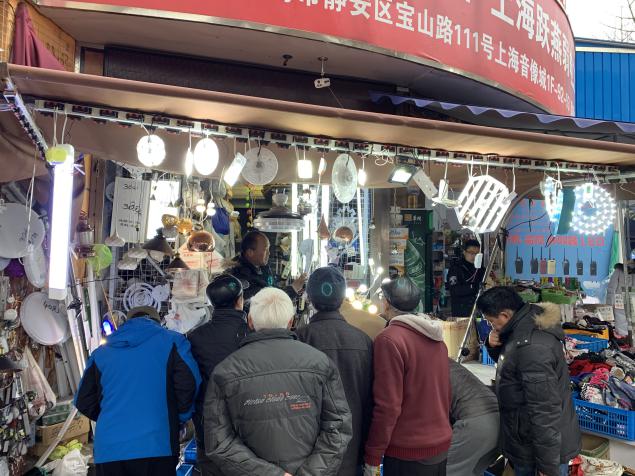 店主用扩音喇叭推销灯具,吸引不少围观者。