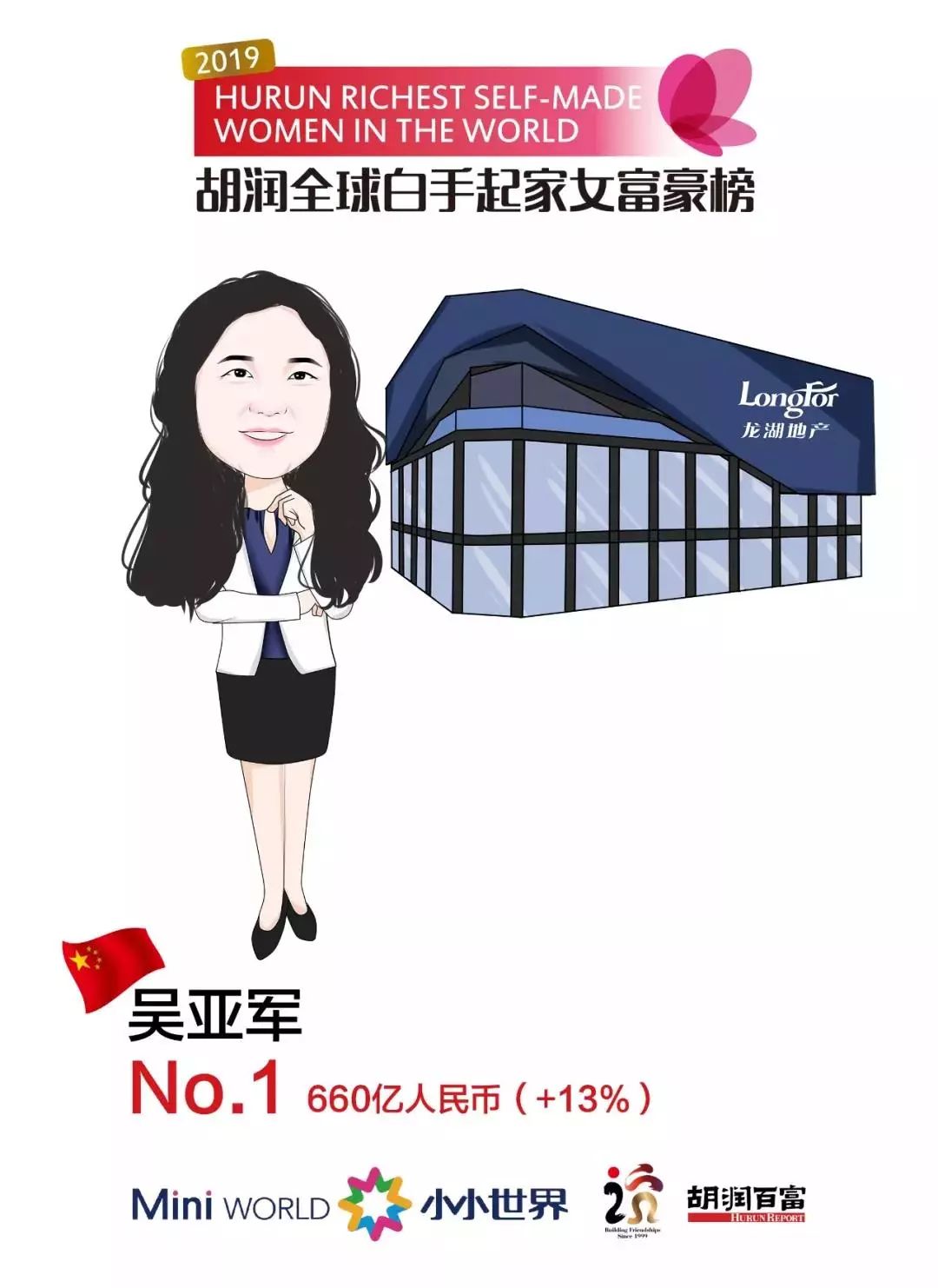 《2019胡润全球白手起家女富豪榜》,吴亚军财富上涨13%,以660亿元排名第一。