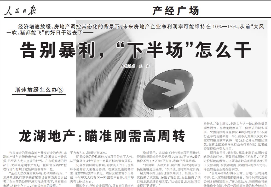 而就在万科开始对高周转有所警醒的同一年,人民日报上发表了一篇名为《龙湖地产:瞄准刚需高周转》的文章。