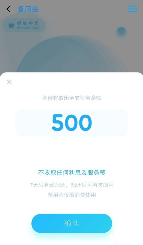 1、每个月可取用 2 次备用金,取用金额为1- 500 元整数单位,取用期限为 7 天(不含申请当天);
