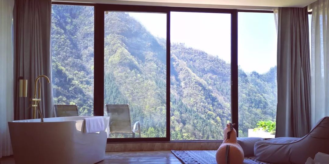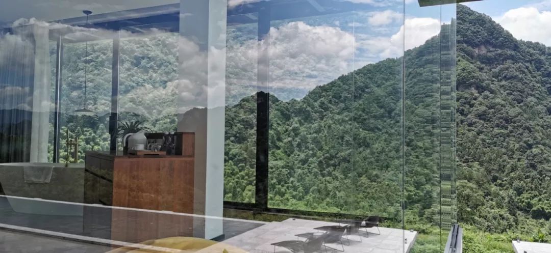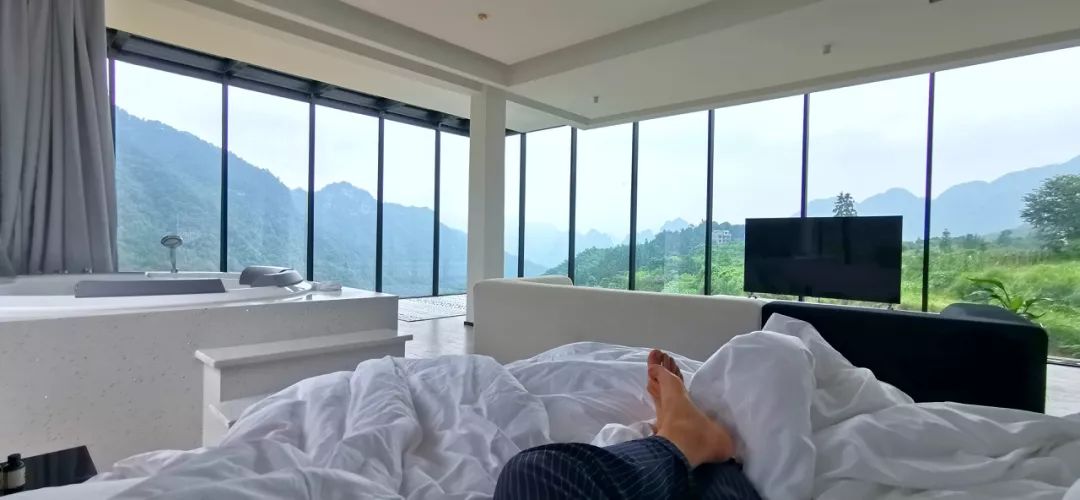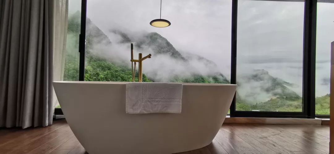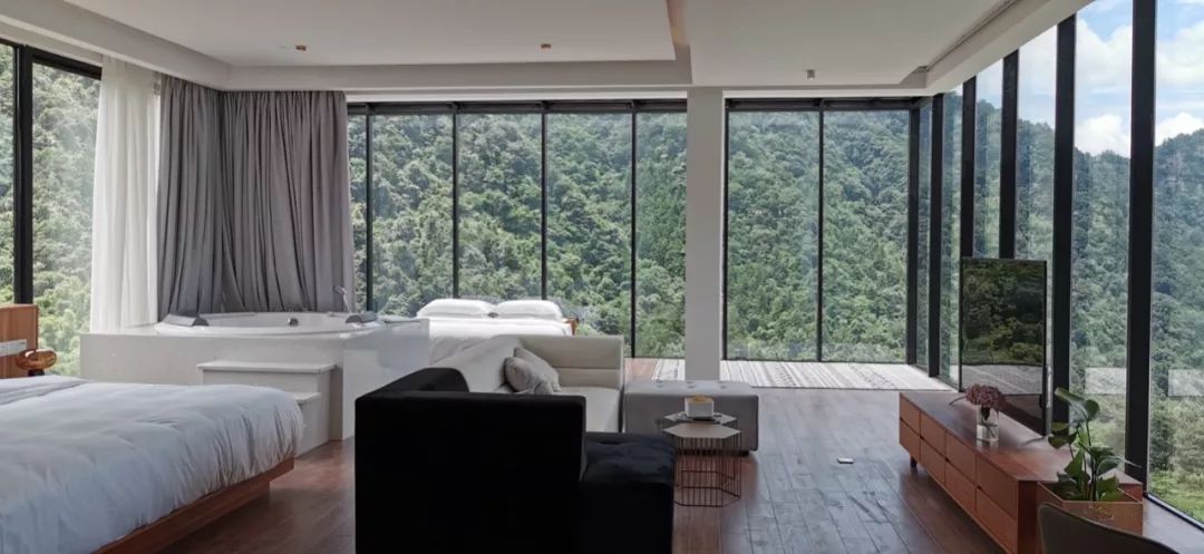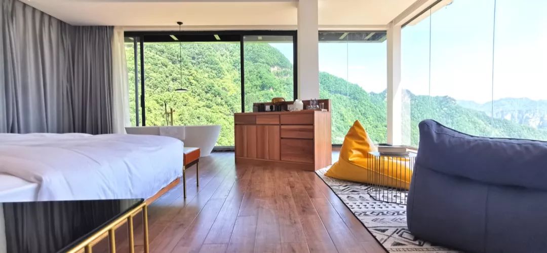 最大的礼物在于每一间房都毫不吝啬地镶上了整面落地窗,部分窗外还有私属露台,无敌山景尽在咫尺,屋子更像是架在空中。