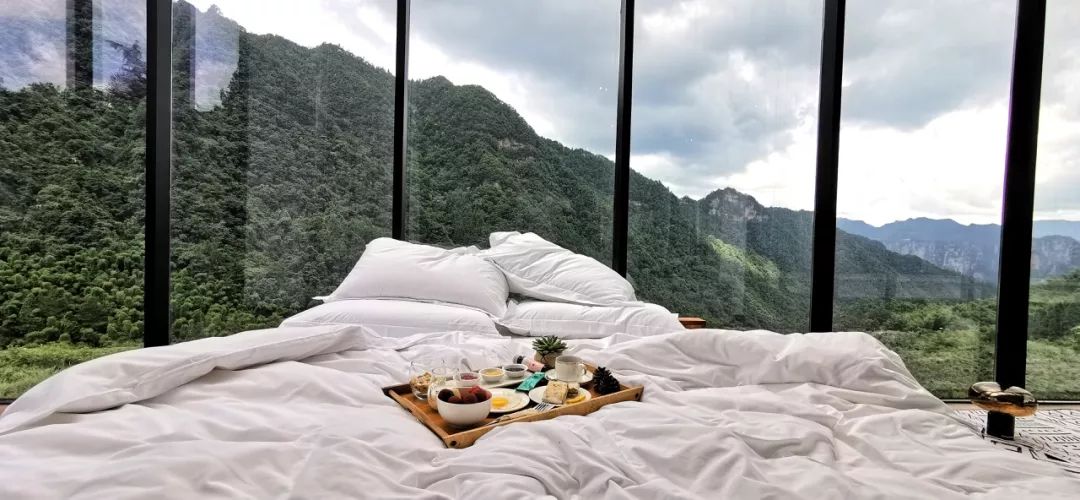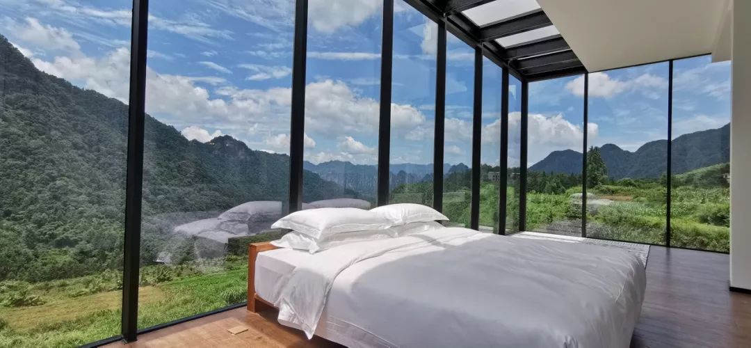 穿雨过云,闯入张家界海拔1000米的半山腰,璞舍透明的落地窗代替了原本的墙体,薄薄地如一面轻纱,结实又防寒阻热,也成为村内特立独行的标志。
