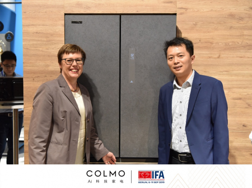 (中国驻德国大使馆公使衔参赞王卫东及COLMO冰箱研发总监张辉参观展区)