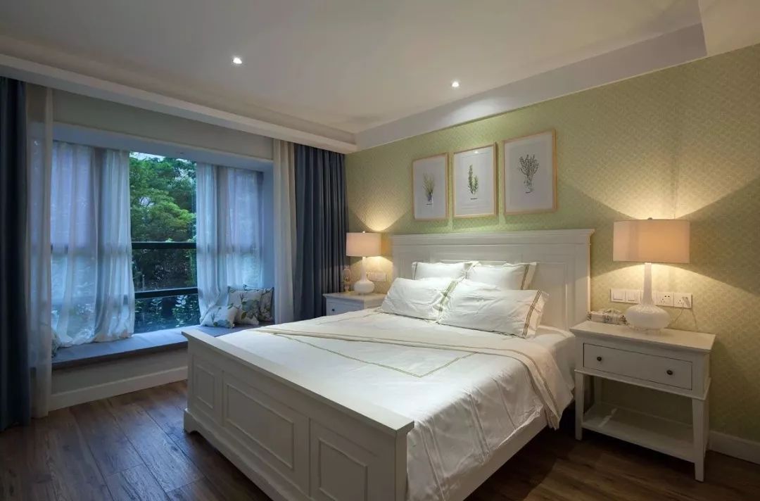 主卧室的床头背景墙被刷成了绿色,上方点缀三幅装饰画。两侧的台灯和床头柜对称摆放,带来了和谐的美感。卧室还有一个小飘窗,也很让人羡慕。