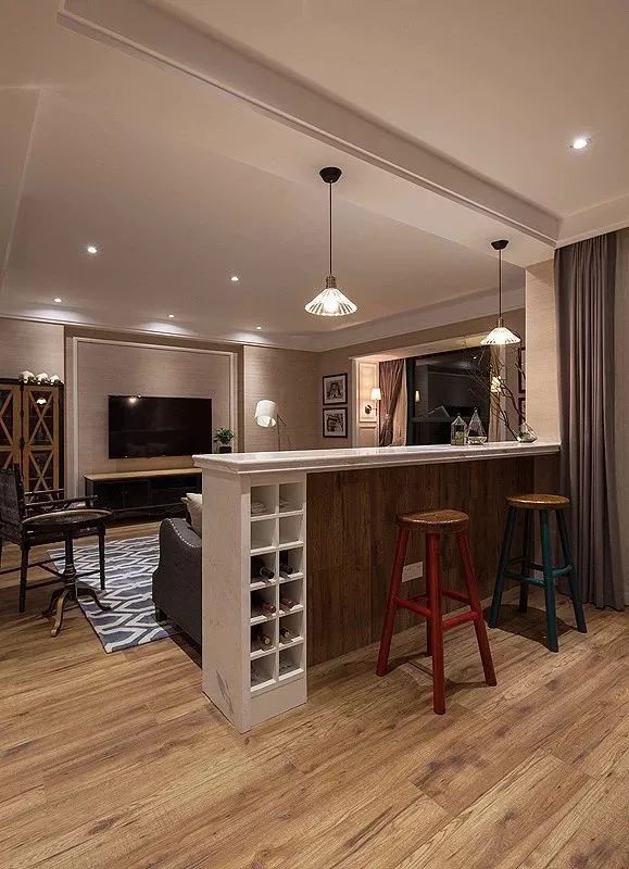 客厅和书房之间是做了一个吧台作为隔断,小吧台底部有个酒柜,和爱人坐在这里看着电视、品着美酒,是多么惬意的事情呀~