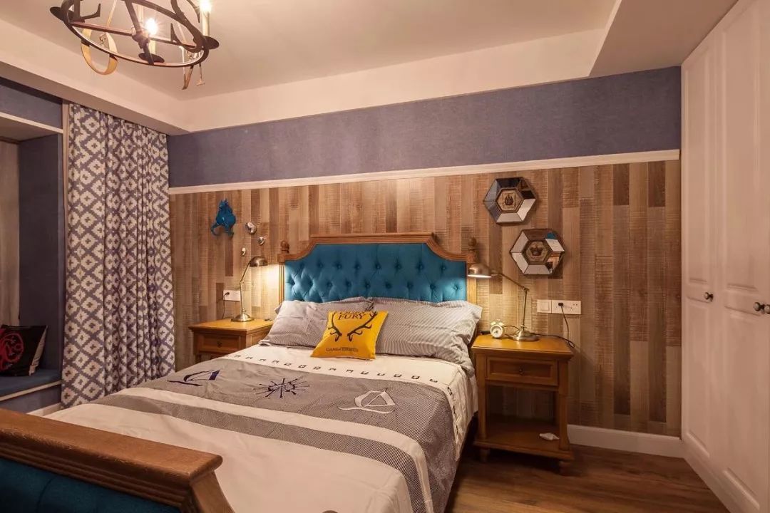 儿童房的设计会更为独特一些,木质的床头背景墙上方还留出一排刷成其他颜色,让儿童房的层次感得以提升,卡通的装饰品也是孩子所喜欢的。