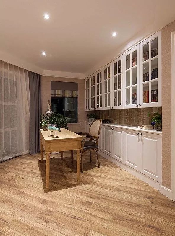 书房的布置也很简单,一张长书桌,利用墙面做了嵌入式的书柜,上方书柜加上玻璃柜门,这样拿取物品会更方便,也可以作为展示架使用。