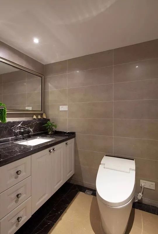 卫生间的设计会比较简单一些,马桶和洗手台放在一起,另外一侧做个淋浴房。黑色大理石的台面和地面带来了时尚感。