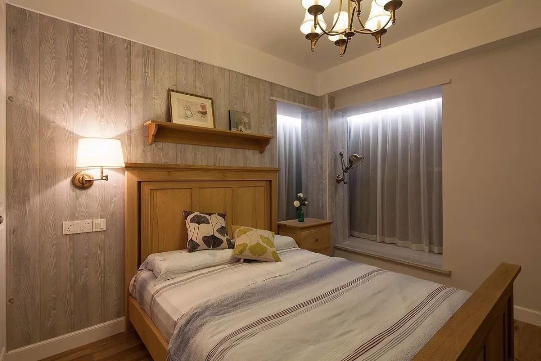 次卧的墙面是铺贴了壁纸,床头上方还有个隔板辅助收纳。整个房子的四间卧室都做了不一样的设计,让人仿佛是从一个家穿越到了另一个家。