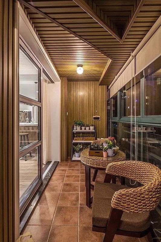 在书房的外面有着一个休闲阳台,地面铺贴了仿古砖,上方做了木质吊顶,搭配藤编的休闲桌椅,这个小阳台展现了质朴的乡村美式风范。
