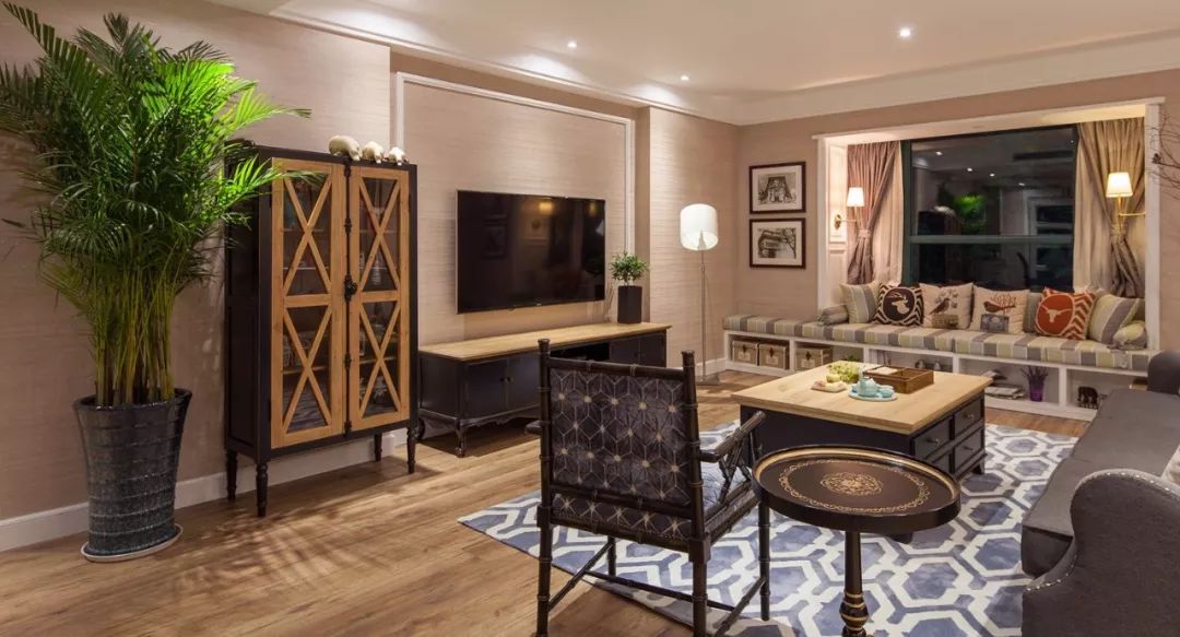 餐厅边上是客厅空间,电视背景墙做了石膏线装饰边框,整体以咖色为主的设计搭配复古款的美式风家具,带来了更为典雅、沉稳的感觉。