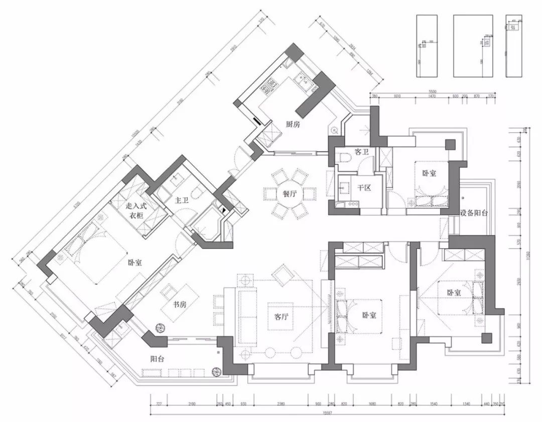 入户就是餐厅的户型,在餐厅边上的不规则角落里做个嵌入式的鞋柜,鞋柜底部和中间留空。圆形的餐桌椅搭配上方的吊顶、灯具,看起来非常大气。