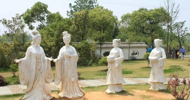 这组塑像在三国雕塑园内,塑像描绘的是小乔出嫁的场景:左边是大乔,大乔旁边头戴花饰者为小乔。《三国志·吴书·周瑜传》记载:“攻皖,拔之。时得乔公两女,皆国色也。策自纳大乔,瑜纳小乔。”