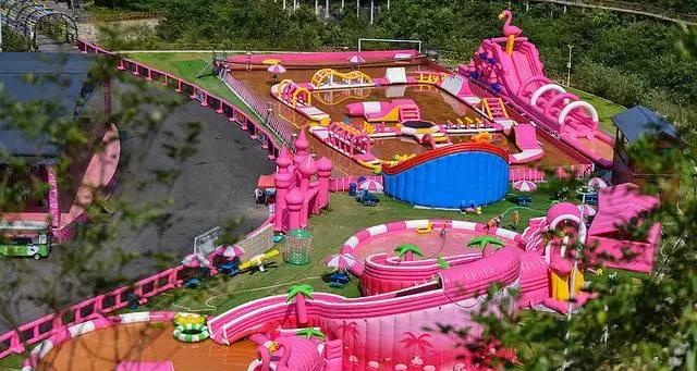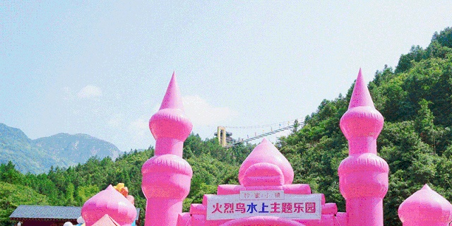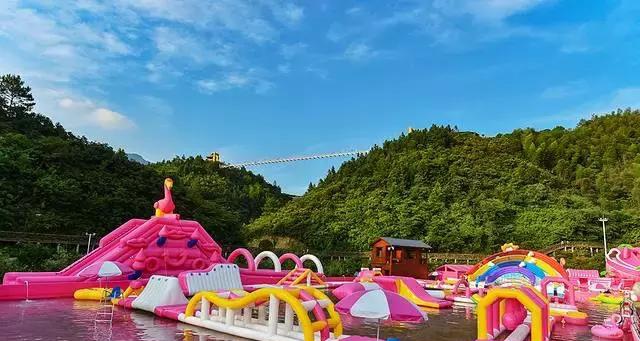 以粉白黄为主打色的亮眼的水上城堡,滑梯、隧道、火烈鸟、香蕉船等水上项目一应俱全。在炎热的盛夏高温里,在一片美丽的青山绿水间,进入终极玩水模式,毫无疑问是大人小孩们都喜爱的娱乐项目。不管是戏水,还是拍照,这里都甚好。