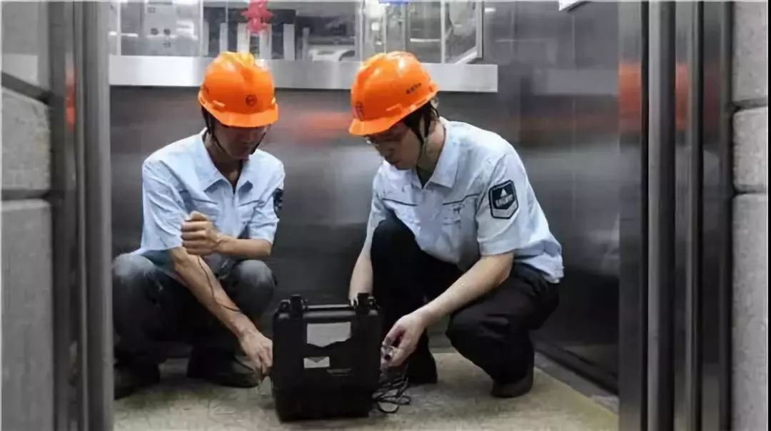 图为电梯检查钢丝绳张力
