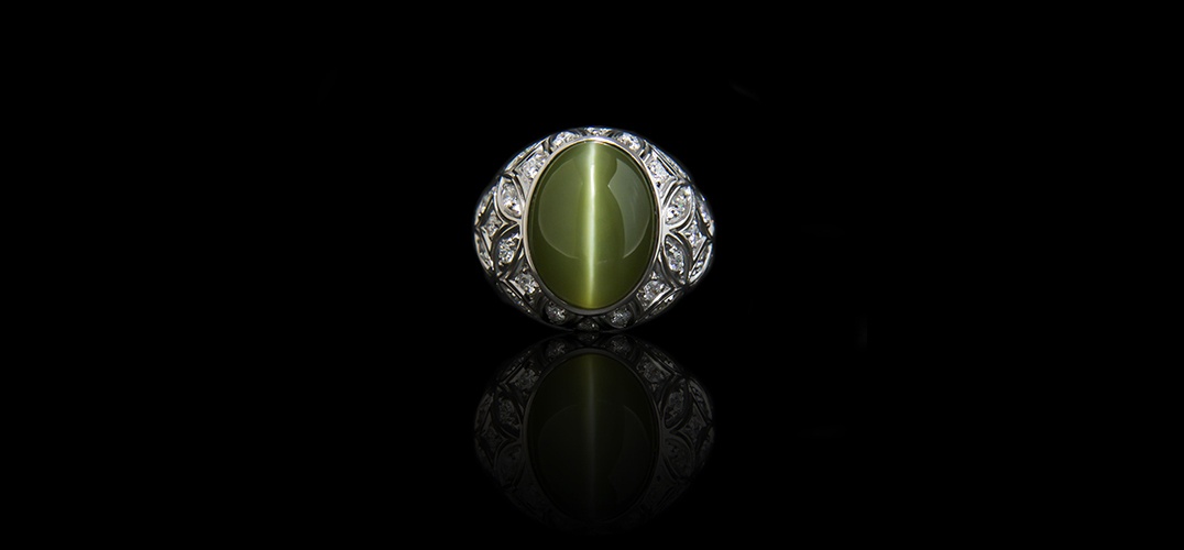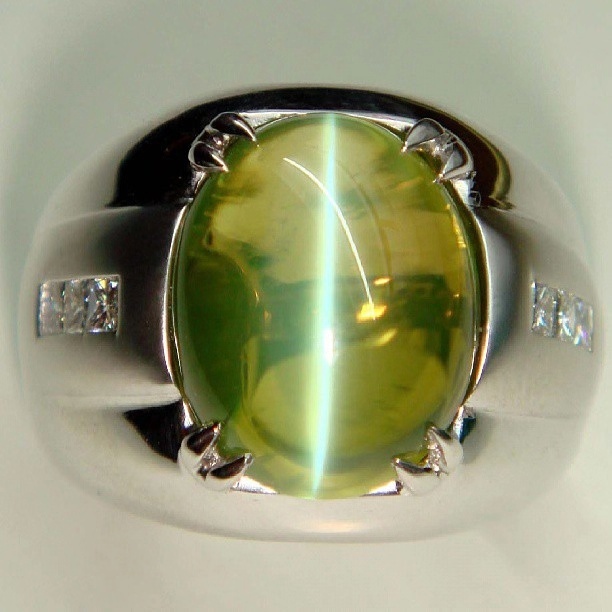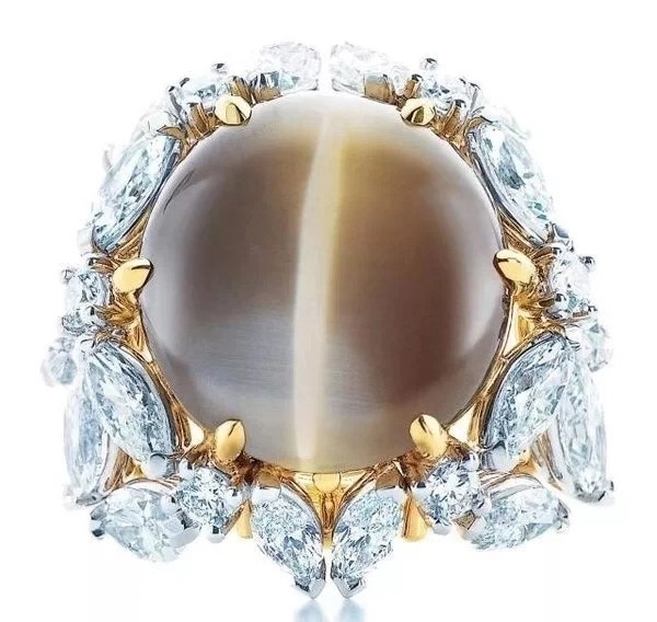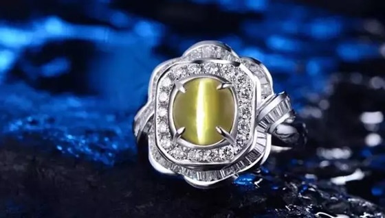 清晰可见的褐黄色“眼线”是猫眼石的主要特征。管状的包体细长而密集,使得猫眼效应特别的明显,纵然是在较弱的光源下也是十分清晰的,优质猫眼石的眼线要求平直且均匀,不仅连续不断且还清晰不混浊,明亮且不灰暗。
