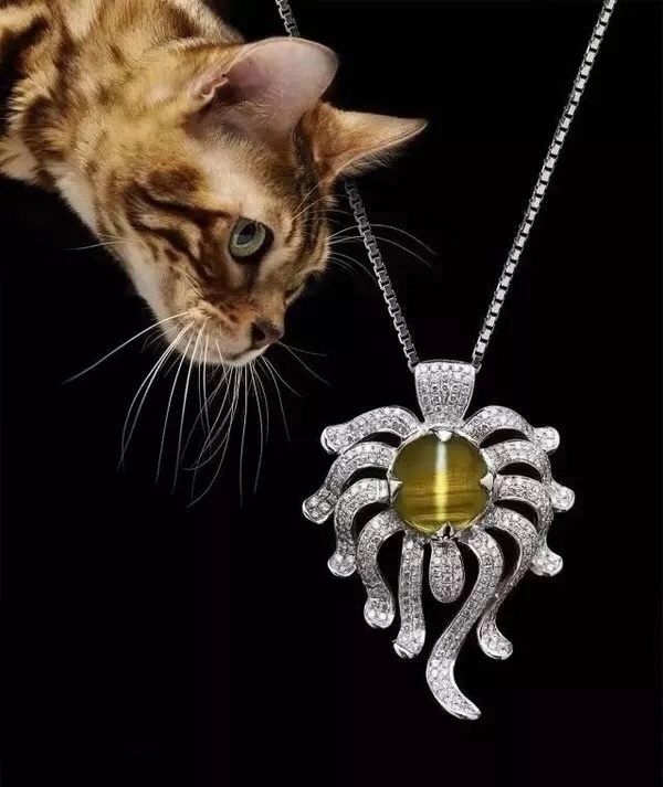 所谓的猫眼效应,就像我前面说的或者电视上都会有的,猫咪们在夜晚降临的时候,如果没有任何灯光照射下,猫咪的眼睛会呈现出两颗星光,这种就是所谓宝石中的猫眼效应(Chatoyancy)。猫眼效应的金绿宝石含有大量平行分布的针状或者丝状的金红石(二氧化钛)包裹体,金红石的折射率为2.60-2.90,包裹体可以是液体包裹体,纤维状等,发生对光的定向发射,其亮线以细长标准,清晰明亮且灵活为最好。当宝石加工成弧面琢型后,弧面呈现出一条明亮并带有一定游动性的闪光或活光光带,宛如猫咪眼时形成的细线。