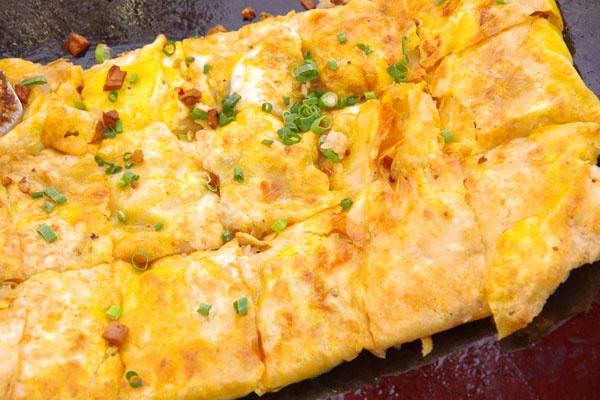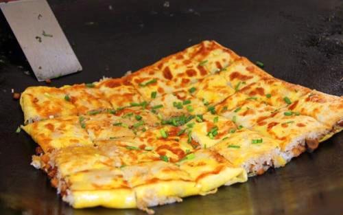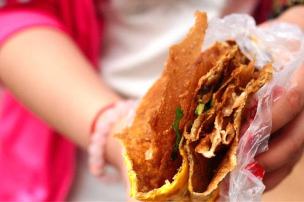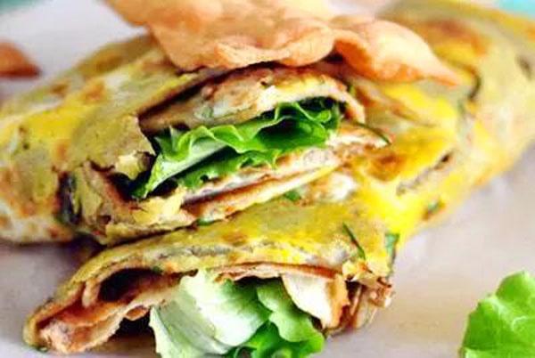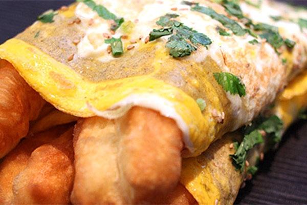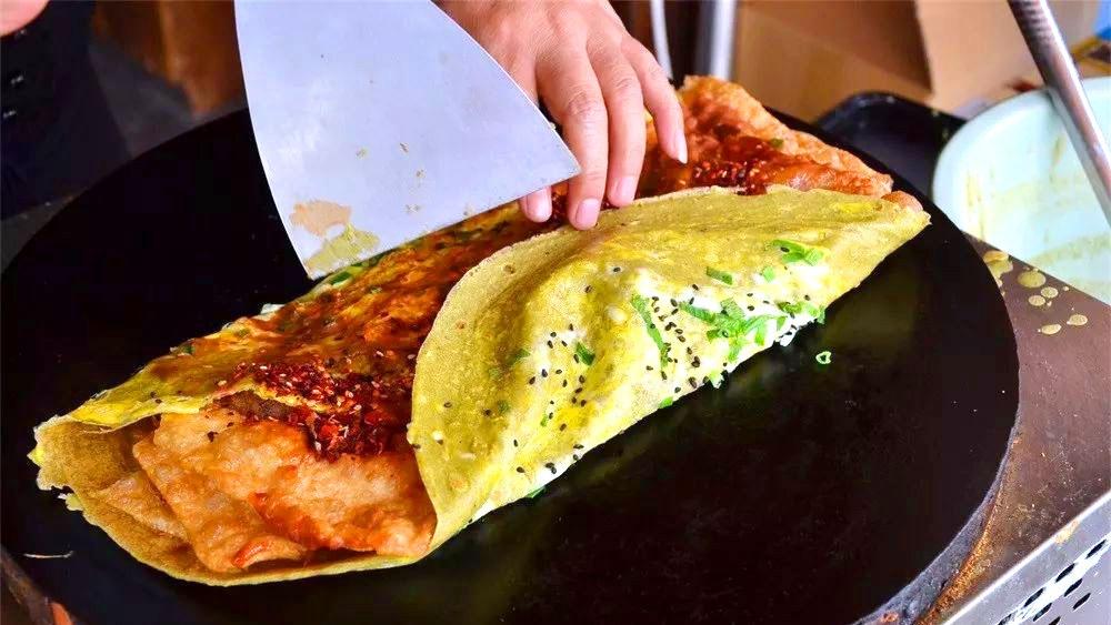 绿豆面薄饼抹上鸡蛋液,裹入油条或脆“馃篦儿”,配以葱末、面酱或辣椒酱,裹成方卷,一个煎饼果子就做好了