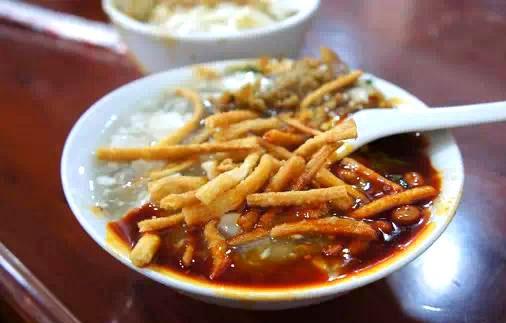 比较特色的还有油茶,在米糊糊上面撒上馓子、花生碎、酥黄豆等东西,再加上盐、辣椒油和葱花,和匀后吃,麻麻香香的十分得劲