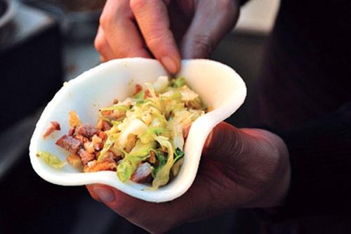 将年糕做成饼皮,包上五花八门的馅料,形似饺子,却比巴掌还大,吃起来软糯筋道,鲜脆可口,很是受大众喜欢