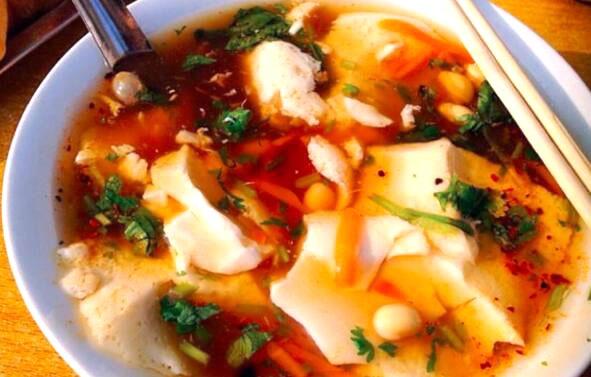 块状的豆腐花垒在碗中,上边码放着一小堆酸豆角、炸豌豆、葱花等食材,再淋上一勺艳丽的红油,那红白相间的模样,根本就无法忽视
