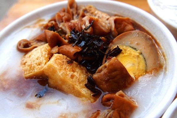 粿汁,与肠粉的地位相同,将米白色的微韧粿片混和米浆一起煮成如同白粥般的微稠物,盖上精心卤煮的各种卤物,再淋上一勺葱油,卤香可口,暖身暖心