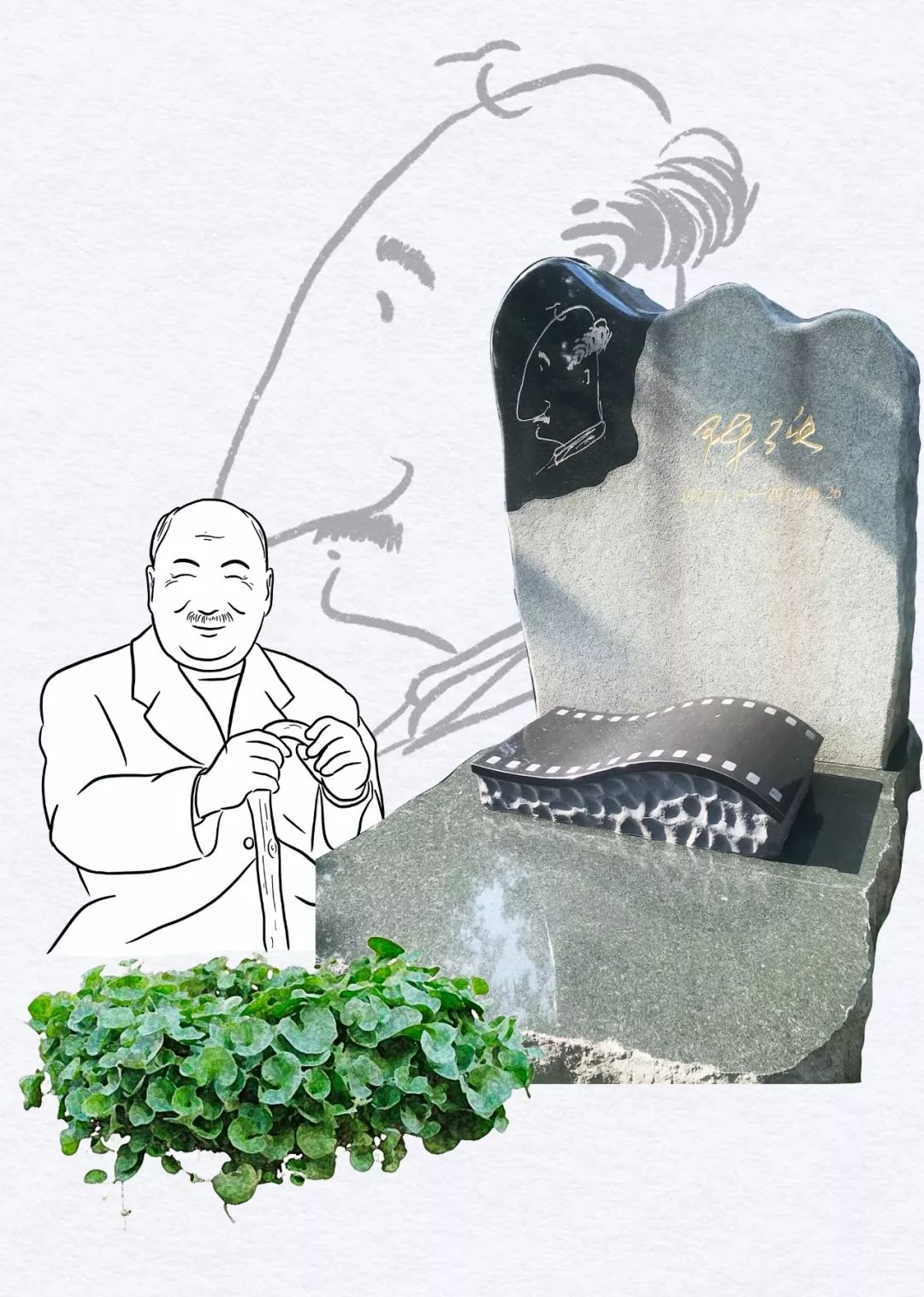 他的墓碑上,有电影胶片的雕塑,还有一个俏皮的漫画像。