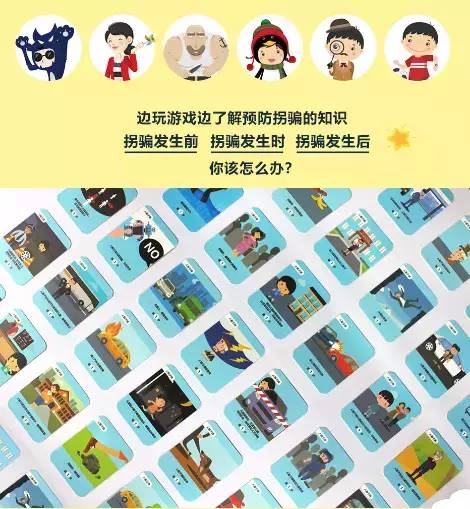 将这些真实场景、对话融入到有趣的桌游中,让爸妈和孩子在互动欢乐的游戏氛围中更好的理解和掌握如何远离儿童拐骗,结合产品册子里的各种要点和方法,在日常生活中大大减少儿童拐骗悲剧的发生几率。