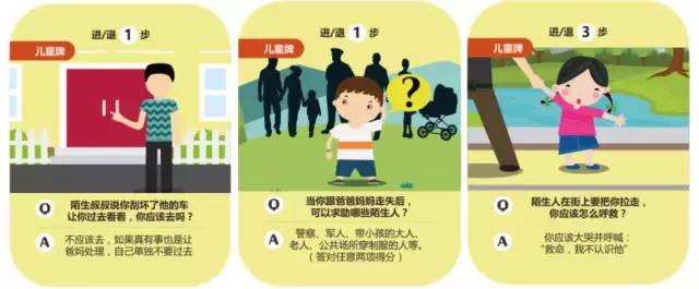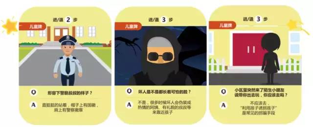 游戏中玩家答对预防诱拐的相关问题,则可以获得前进步数,反之则有可能被人贩子追上,导致失败。骰子点数,地图捷径和场景答题卡是游戏获胜的关键。