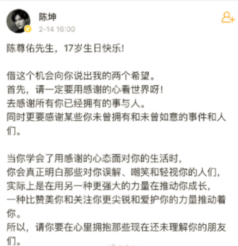 此前,陈坤还在温哥华时间2月14日凌晨零点的时候,发长文为儿子陈尊佑庆生,庆祝儿子17岁生日快乐。