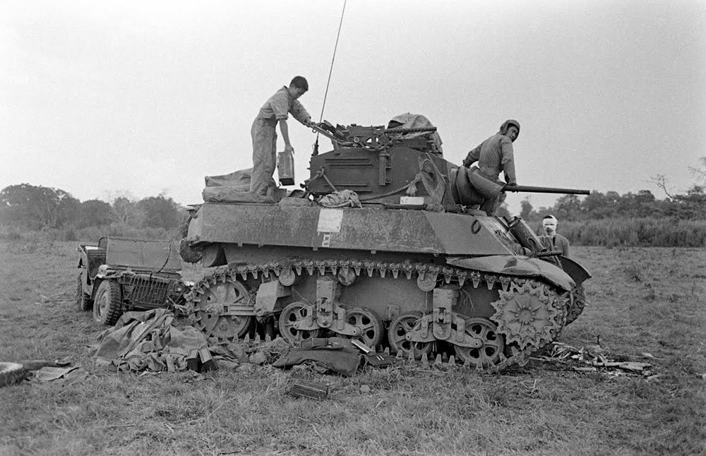 1944年4月,中国驻印军第1坦克营正在缅甸执行作战任务,该部队装备的是美制M3“斯图亚特”轻型坦克,主要武器为一门37mm坦克炮,辅助武器为两挺7.62mm机枪。