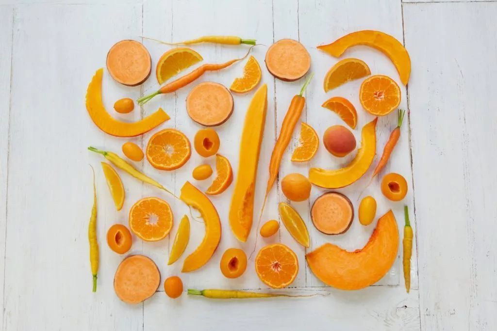 橙色和黄色是属于阳光的颜色,橙色食物中,大多含有丰富的类胡萝卜素、维生素C。蔬果的橙色由β-胡萝卜素形成。β-胡萝卜进入人体后,可以转变为维生素A,有益视力健康。而维生素C是人体内维持免疫功能,保持血管的完整,促进非血红素铁吸收等所必需的。同时维生素C还具备有抗氧化,清除自由基的作用,从而达到美白,抗衰老的功效。