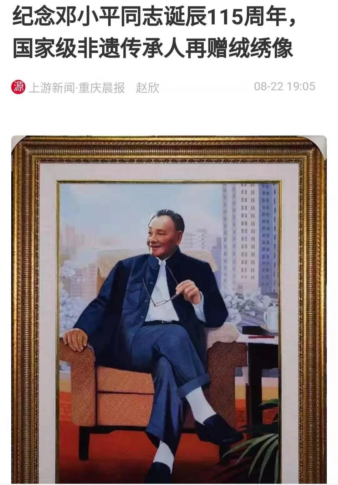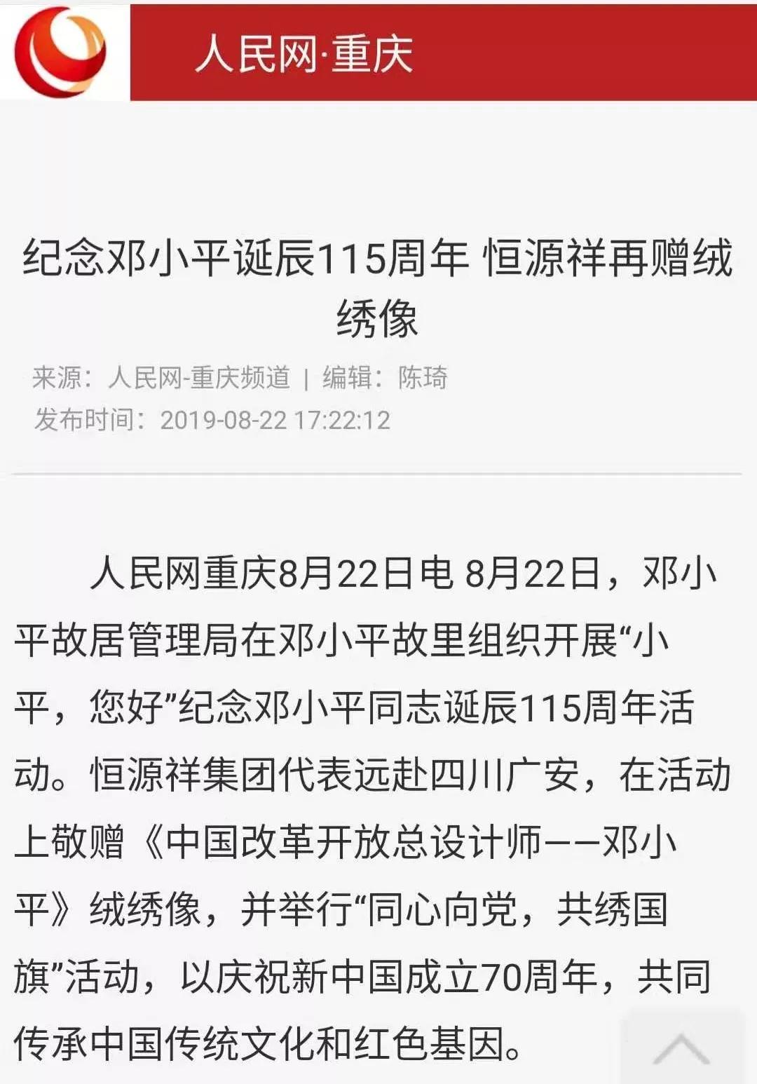 人民网以“纪念邓小平诞辰115周年 恒源祥再赠绒绣像”为题进行报道: