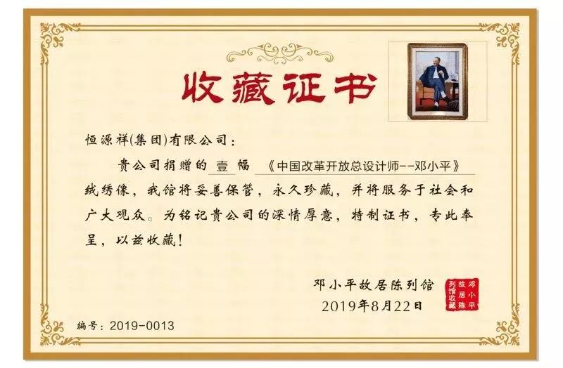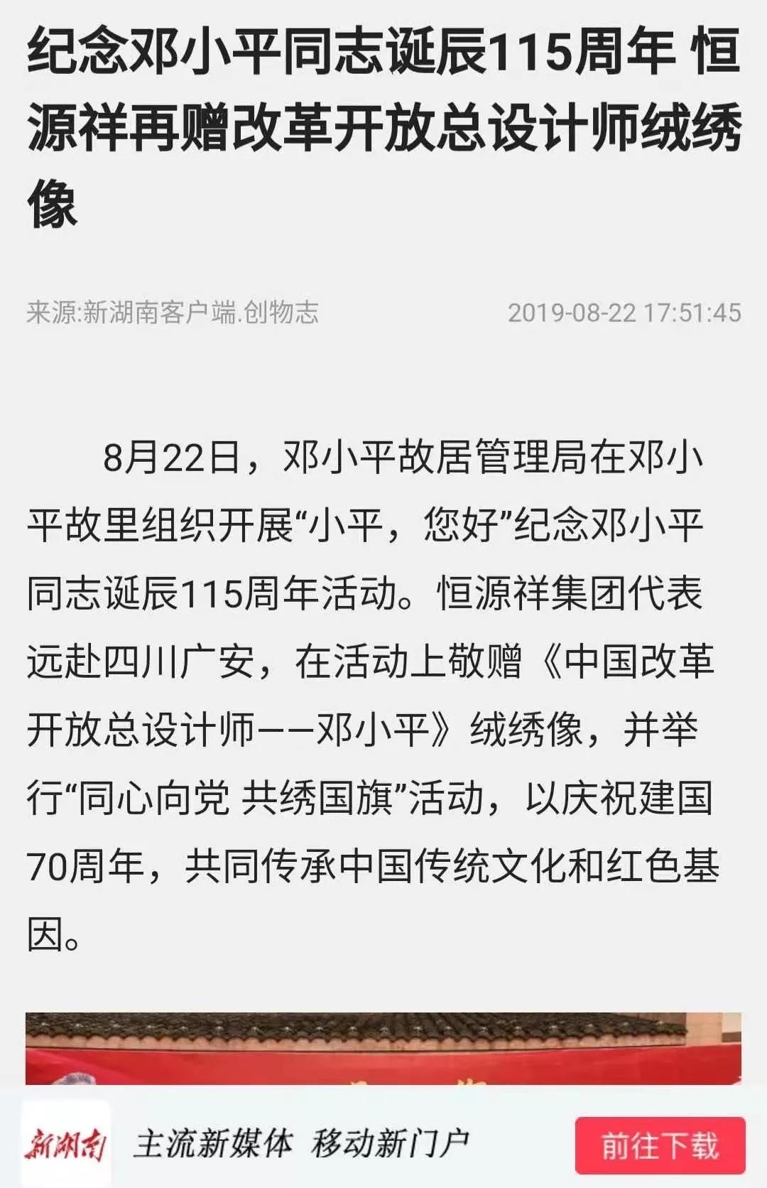 8月22日,邓小平故居管理局在邓小平故里组织开展“小平,您好”纪念邓小平同志诞辰115周年活动。恒源祥集团代表远赴四川广安,在活动上敬赠《中国改革开放总设计师——邓小平》绒绣像,并举行“同心向党 共绣国旗”活动,以庆祝建国70周年,共同传承中国传统文化和红色基因。
