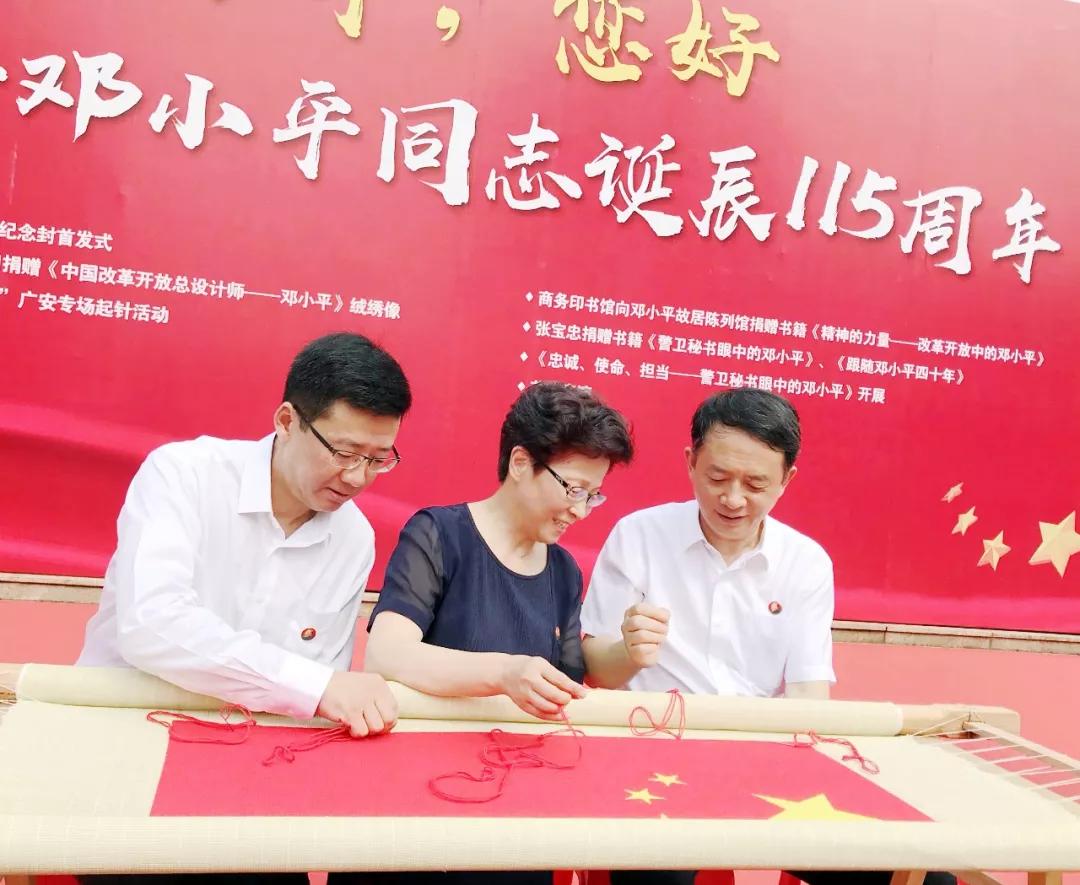 在纪念活动中,另一项以国家级非物质文化遗产为载体的“同心向党 共绣国旗”广安专场起针活动同期举行。邓小平故居管理局局长钱奇和恒源祥集团总经理陈忠伟为本场活动起针。