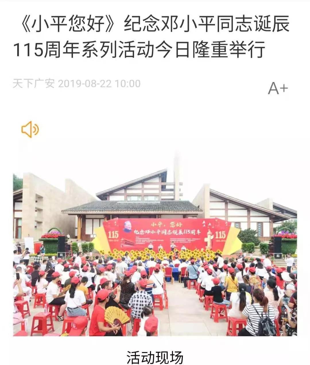 天下广安以“《小平您好》纪念邓小平同志诞辰115周年系列活动今日隆重举行”为题进行报道: