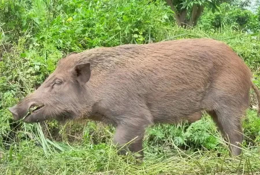 野猪体躯健壮,四肢粗短,头较长,耳小并直立,犬齿发达,雄性上犬齿外露,并向上翻转,呈獠牙状,耳披有刚硬而稀疏针毛,背脊鬃毛较长而硬。最大的成年野猪体重可达近半吨,奔跑时速80公里,那长长的獠牙很有杀伤力!它能与虎搏斗,发狂状态的野猪甚至可以杀死老虎和棕熊。