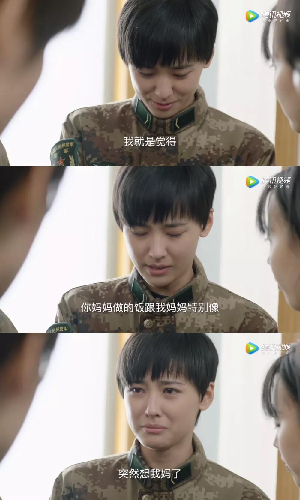 在品尝战友从家里带来的饭菜时,她会调侃活跃气氛,缓解战友不能陪父母甚至都不能在家吃一顿饭的伤感;也会在吃到战友妈妈做的菜时想到自己的妈妈,从而瞬间红了眼眶,丁笑滢在剧中情绪的自然转换也感染了屏幕前的每一个人。