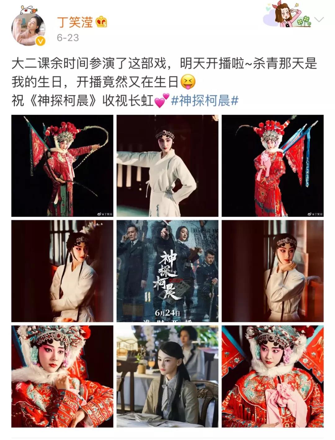 在校期间丁笑滢曾出演过《家》、《即兴》等戏剧作品,话剧舞台是磨练演员演技的最好途径之一,身形、台词以及对人物的理解考验着台上每一个人的发挥,而在那些排练时间里,每一次她都争取将最好的状态呈现在舞台上。大二利用课余时间参演的网剧《神探柯晨》,里面的戏曲扮相出场就受到一致好评,这是作为演员能得到的最好赞赏。