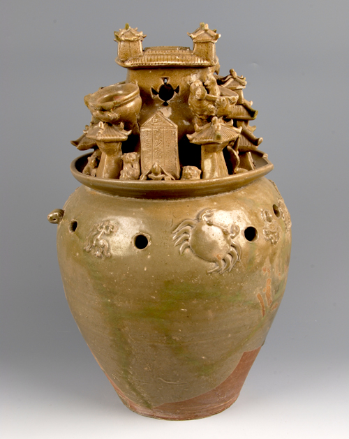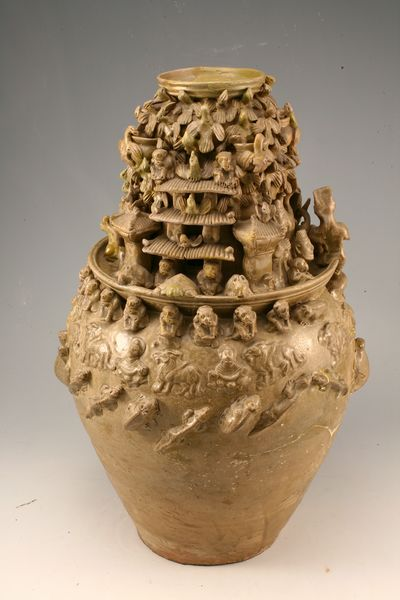 堆塑罐源于汉代的五联罐,又称“谷仓”、“魂亭”、“神亭”,也称“魂瓶”,是长江中下游地区三国、两晋时期随葬明器。