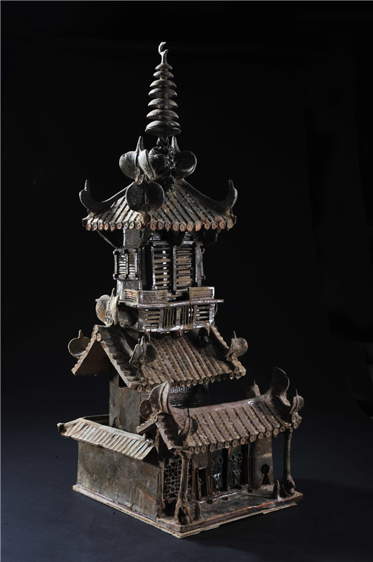 通高104、进深31、宽33厘米。 2008年10月樊城蔡越墓出土。陶楼由门楼、院墙和二层楼阁组成。院墙的平面呈长方形,左、右、后三面墙顶盖双坡式檐瓦。前墙较高,上承双面坡屋顶,前坡下有两根八边形廊柱相承,廊柱和前墙以两横梁相连,后坡檐搭于左右围墙之上,形成门楼。两廊柱下有熊形柱础,内侧有两根拴马桩。